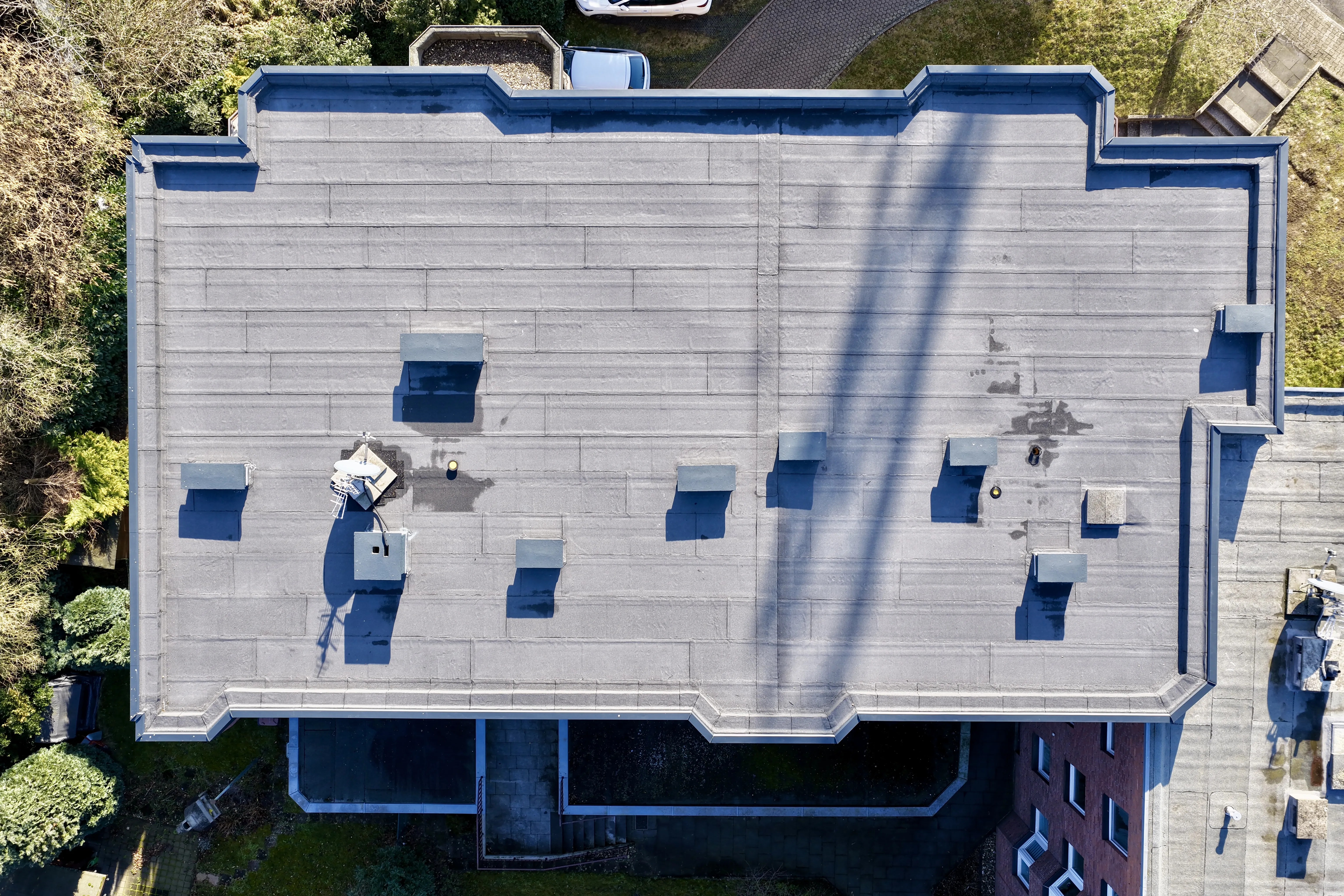 Bei diesem Projekt in Düsseldorf wurde ein Flachdach mit rund 90 Metern Attika vollständig saniert. Eine besondere Herausforderung war die komplexe Attika-Geometrie mit zahlreichen Ecken, Übergängen und Anschlusspunkten, die eine sehr genaue Detailplanung und saubere handwerkliche Umsetzung verlangte. Gerade an Kanten, Innen- und Außenecken sowie an den typischen Übergängen zwischen Fläche, Attika und Abdeckungen entscheidet sich, ob eine Abdichtung dauerhaft zuverlässig bleibt.Im Zuge der Sanierung wurden die vorhandenen Abdichtungslagen fachgerecht zurückgebaut bzw. erneuert und die Dachfläche neu abgedichtet. Zusätzlich wurden die Attika-Details präzise ausgebildet: Anschlüsse, Aufkantungen und Randbereiche wurden so ausgeführt, dass Wasser sicher abgeleitet wird und kritische Stellen langfristig geschützt sind. Durch die konsequente Ausbildung der Details konnte eine dauerhaft dichte, witterungsbeständige Lösung geschaffen werden – insbesondere dort, wo die vielen Ecken und Anschlüsse sonst ein erhöhtes Risiko für Undichtigkeiten darstellen.